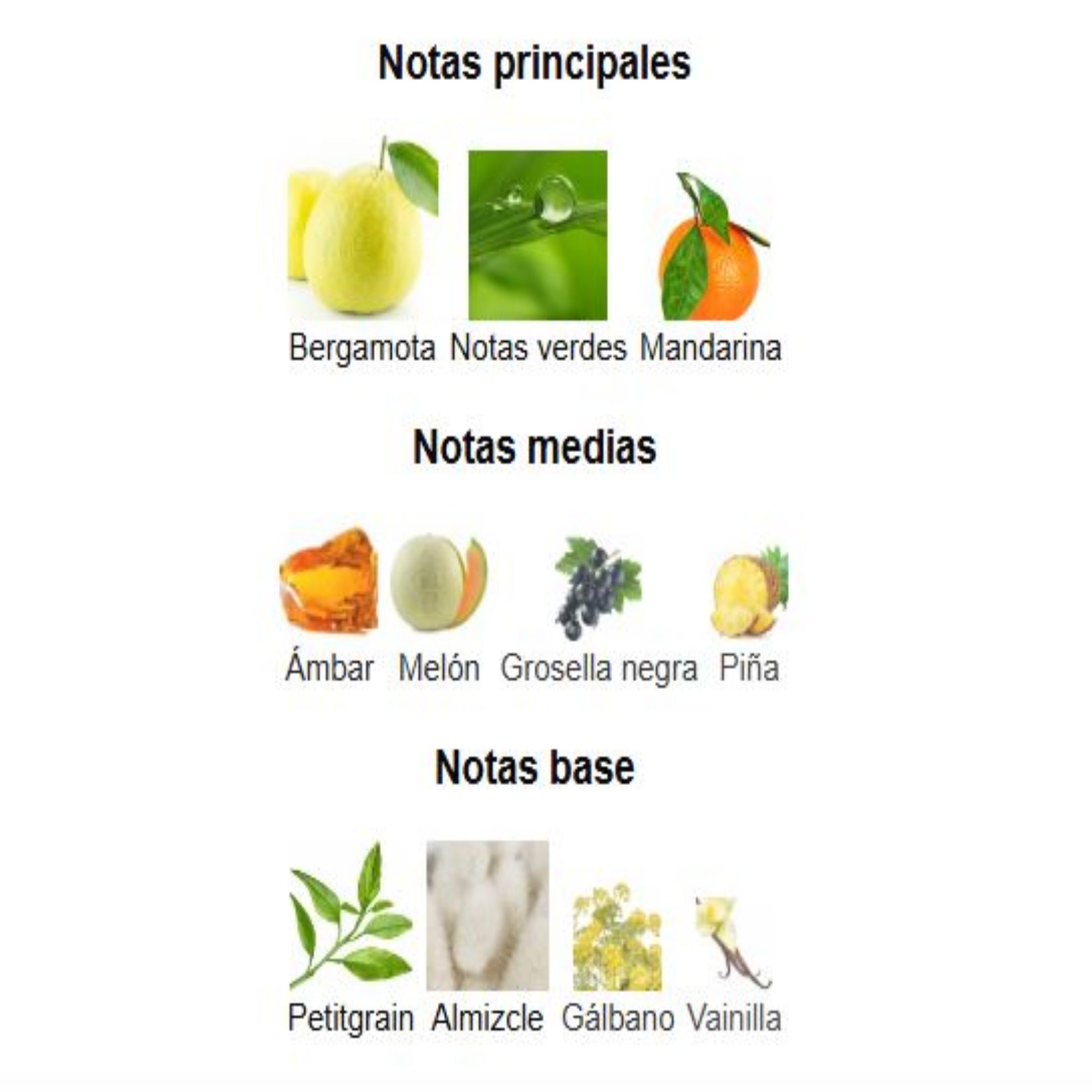Perfil acuático–frutal tropical: melón y piña jugosos sobre grosella negra, matizados por un toque ámbar que aporta calidez y cuerpo sin perder frescura.