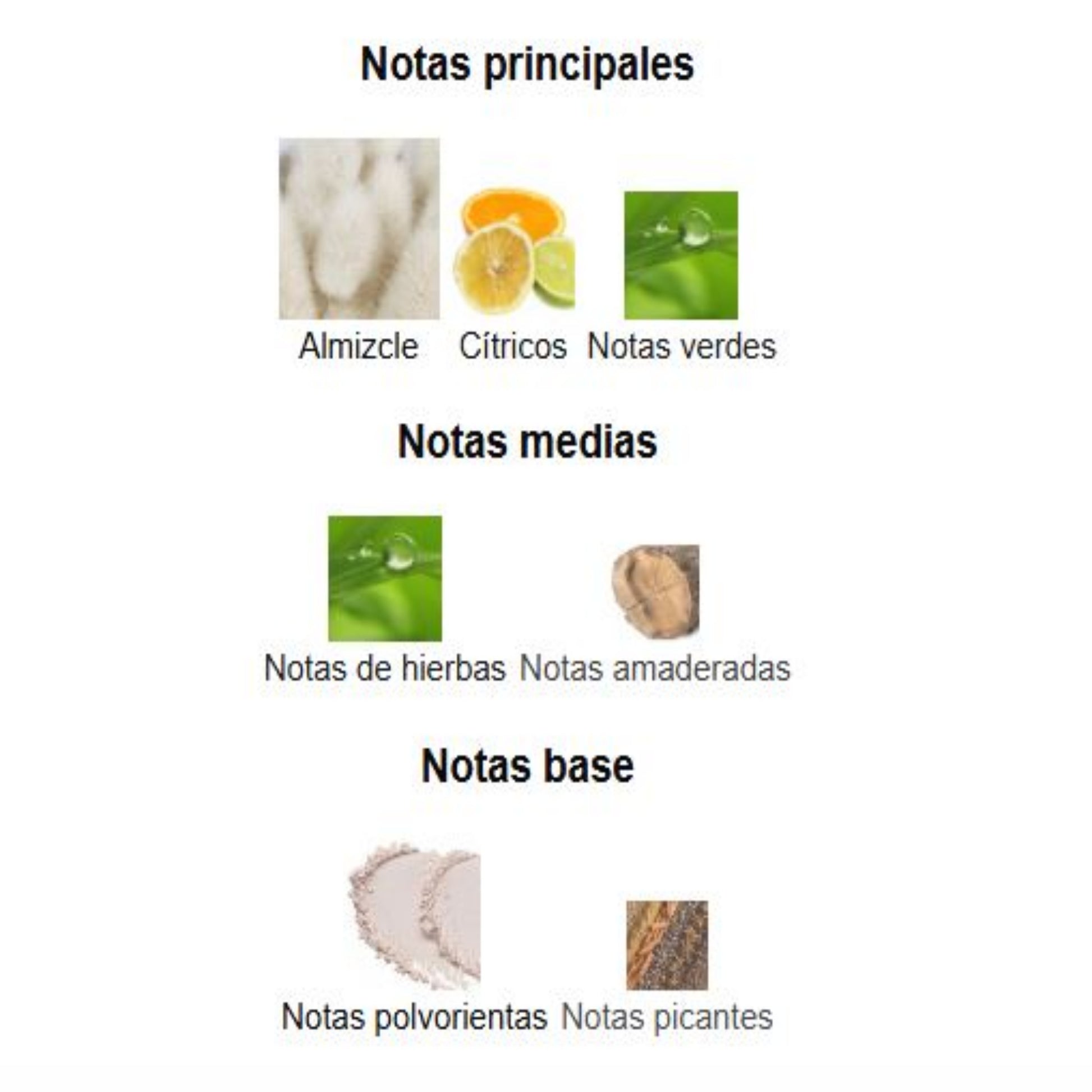 Perfil aromático–especiado minimalista: cítrico/verde al inicio → herbal/amaderado en el corazón → empolvado/especiado en el secado. Versátil, sobrio y pulido para uso diario.