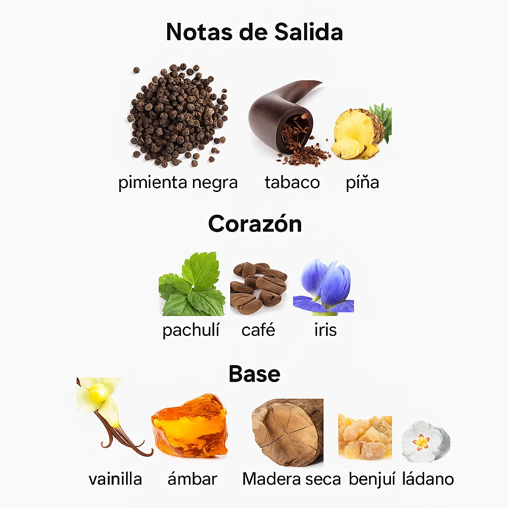 El centro se suaviza con la vainilla cremosa y el acorde tostado de café, envueltos por la faceta terrosa–verde del pachulí. El balance entre lo dulce, lo amargo y lo especiado construye una identidad masculina intensa y moderna.