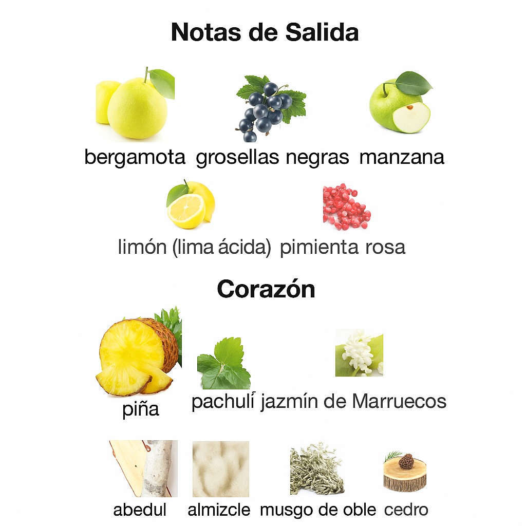 Explota frutal y luminosa con piña jugosa, manzana crujiente, bergamota brillante y grosella negra (cassis) que aportan un frescor verde y chispeante desde el primer spray.