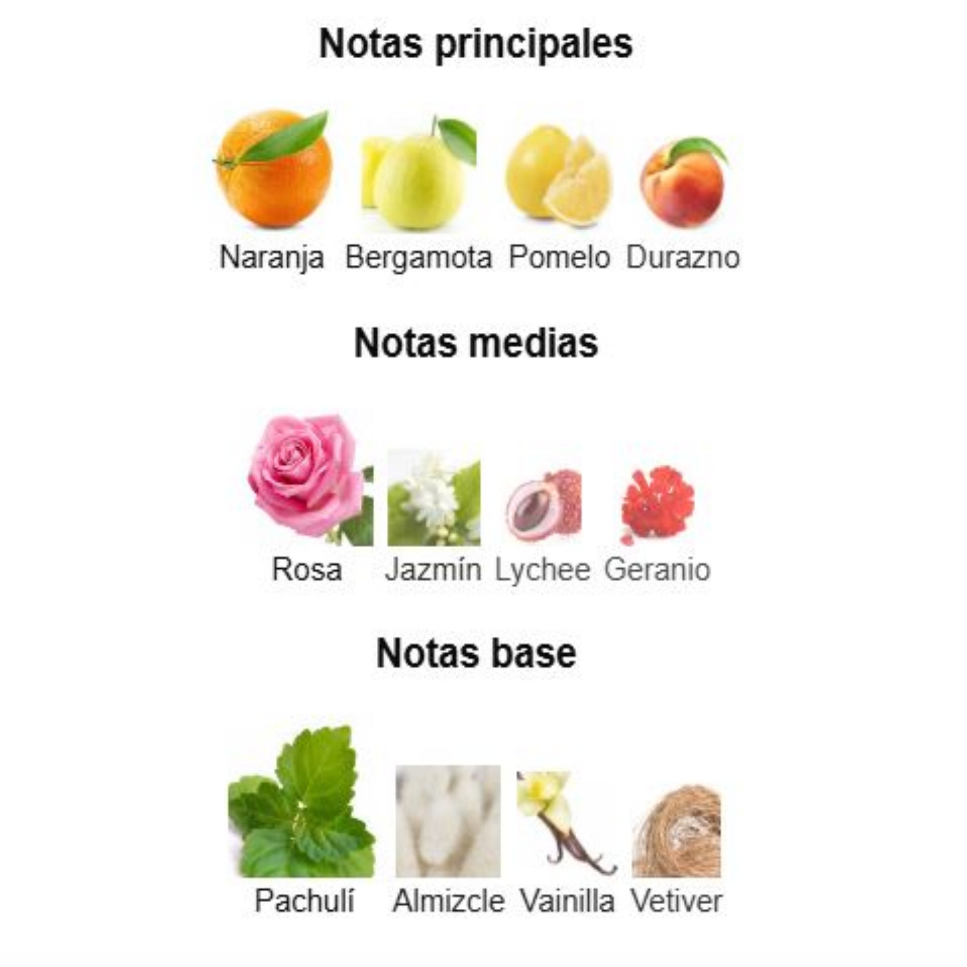 Floral–frutal elegante con base vainilla/musk: luminoso al inicio, floral sofisticado en el corazón y limpio–amaderado al final. Versátil para día y tarde/noche.
