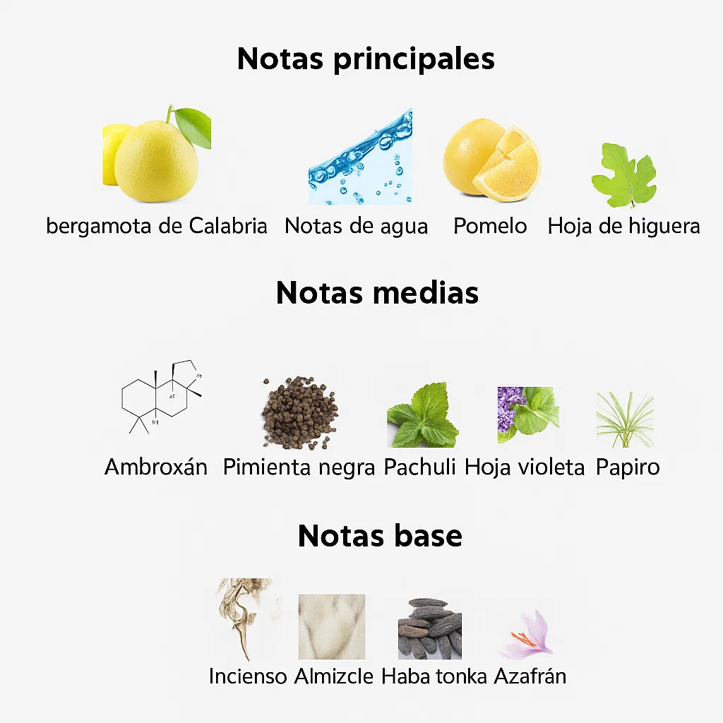 La fragancia se abre con una explosión de cítricos frescos y jugosos, donde destacan la bergamota de Calabria, el pomelo chispeante y un acorde de notas acuáticas cristalinas, suavizadas por el frescor verde de la hoja de higuera.