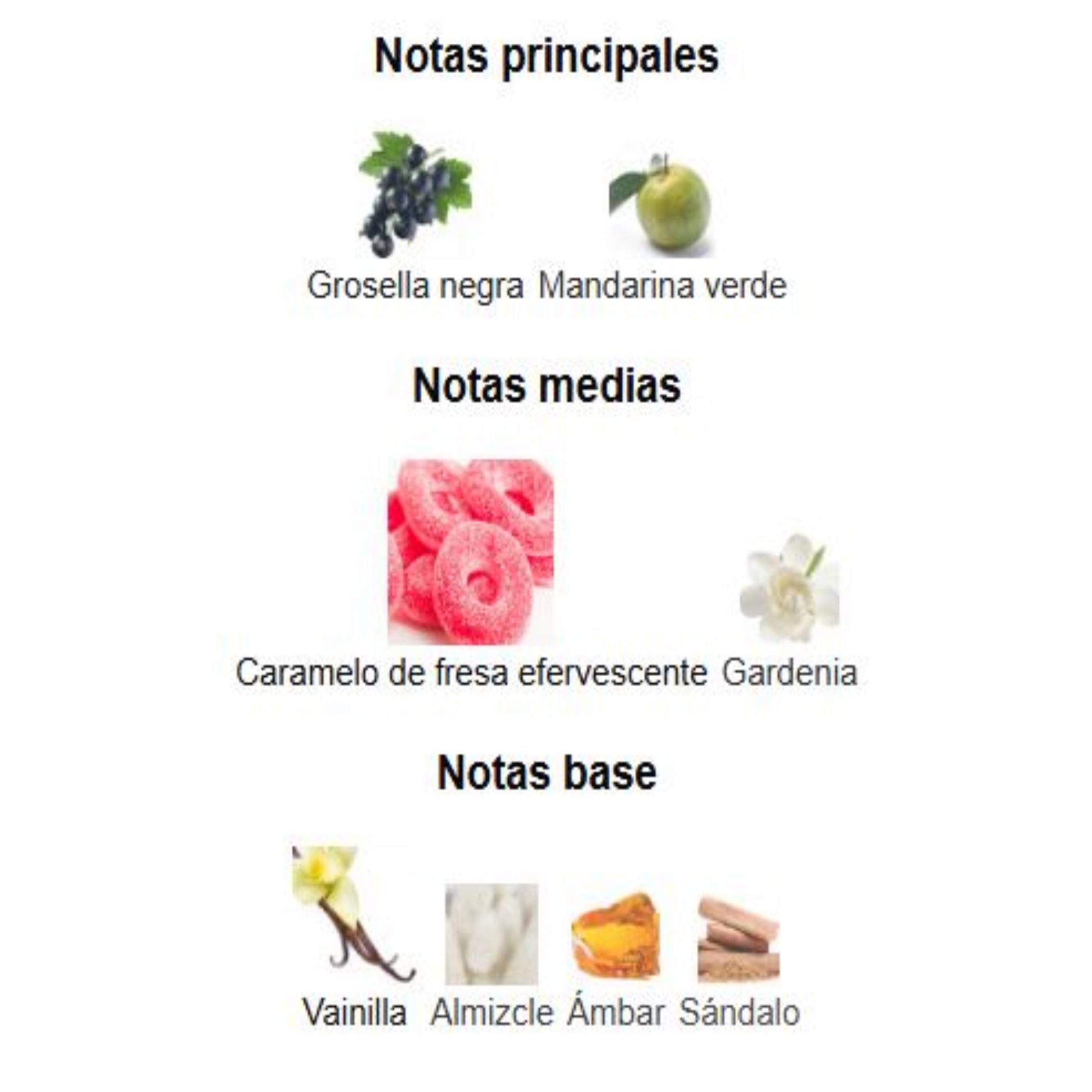 En el centro aparece el acorde protagonista: “strawberry fizz candy” (caramelo efervescente de fresa) sobre gardenia cremosa. Es dulce, burbujeante y femenino, con textura floral que evita el empalago.