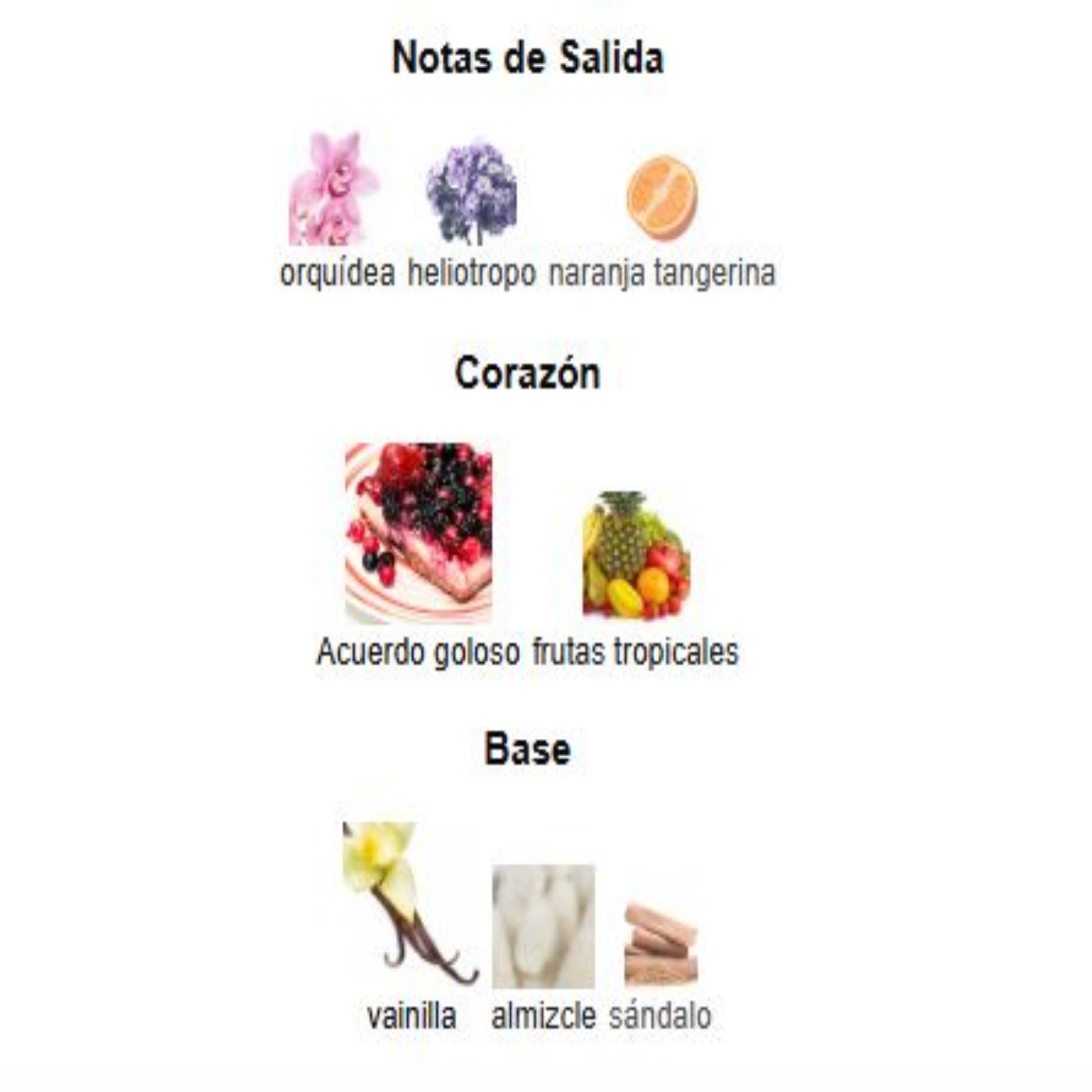 Ámbar vainilla afrutado–floral: fácil de gustar, femenino y reconfortante; ideal si te atraen los perfiles dulces cremosos con toque tropical.